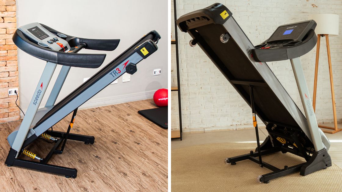 - Speedo TR4: Também compacta e dobrável, mas com lona de caminhada mais ampla (126 x 46 cm), garantindo mais conforto e segurança.